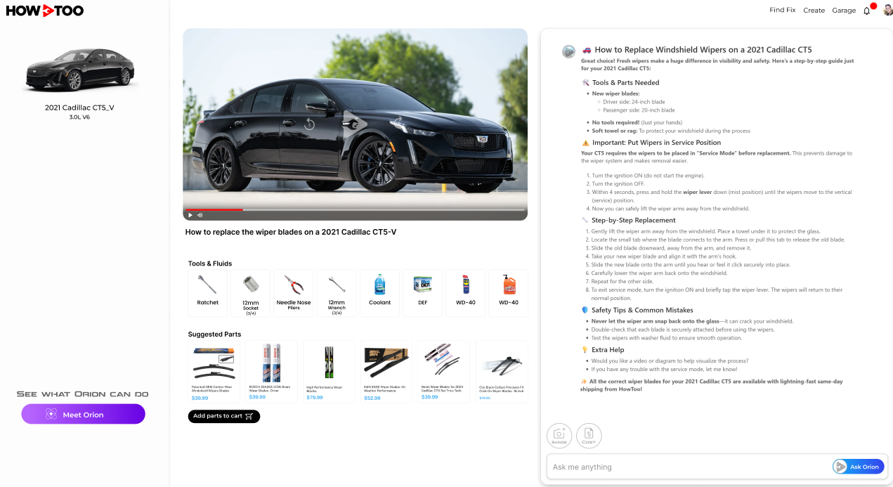 When it's time to fix it, Orion lays out the steps, tools, and guided videos. It can also point you to the right part when you need one, but the real win is simple: less guessing, fewer wrong turns, and more confidence.